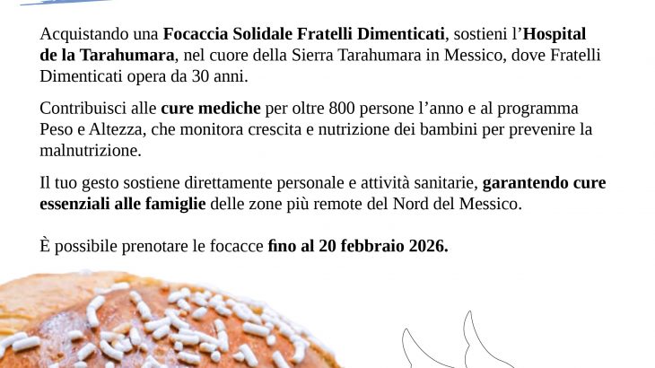 Pane che nutre la vita dei bambini Un gesto semplice, quotidiano, può trasformarsi in cura, presenza e speranza. Acquistando una Focaccia Solidale Fratelli Dimenticati sostieni l’Hospital de la Tarahumara, nel cuore della Sierra Tar...
