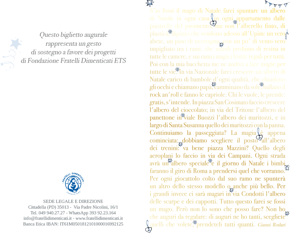 Questo biglietto augurale rappresenta un gesto di sostegno a favore dei progetti di Fondazione Fratelli Dimenticati ETS.