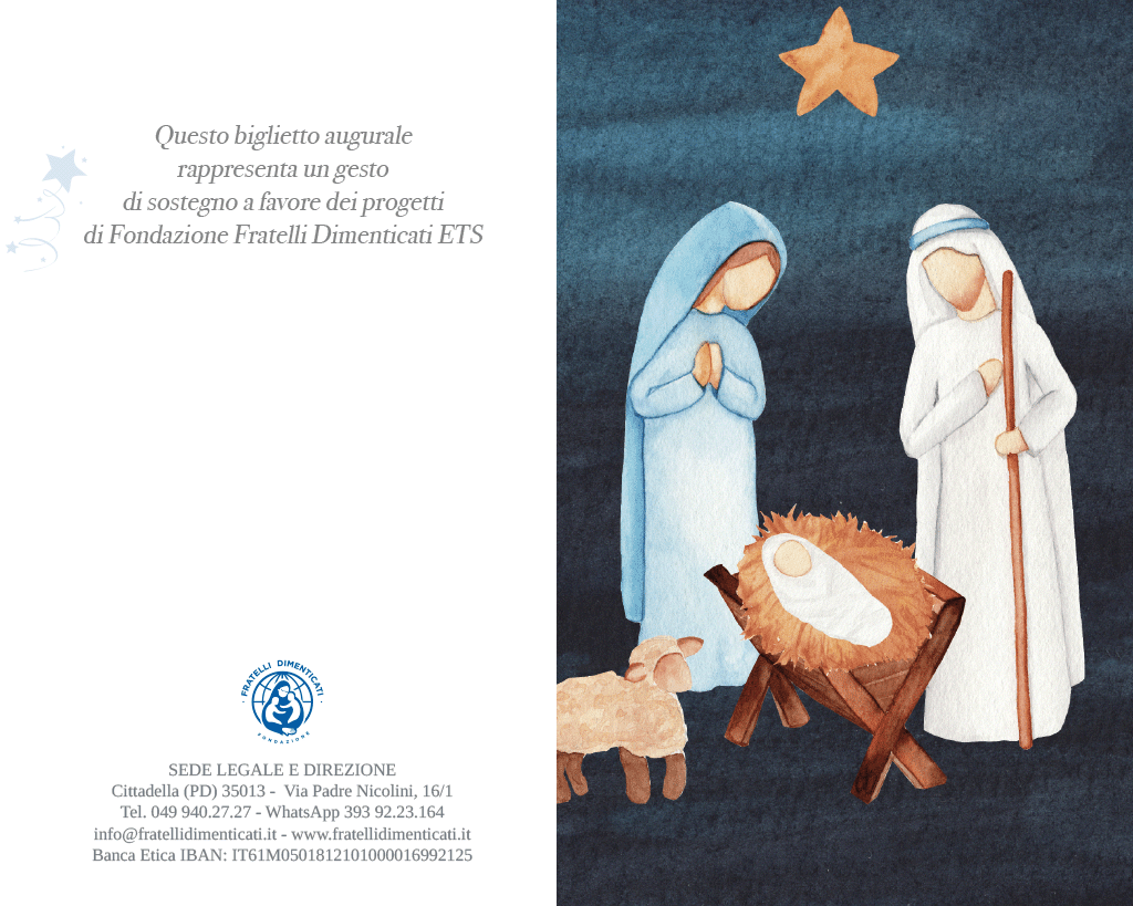 Questo biglietto augurale rappresenta un gesto di sostegno a favore dei progetti di Fondazione Fratelli Dimenticati ETS.